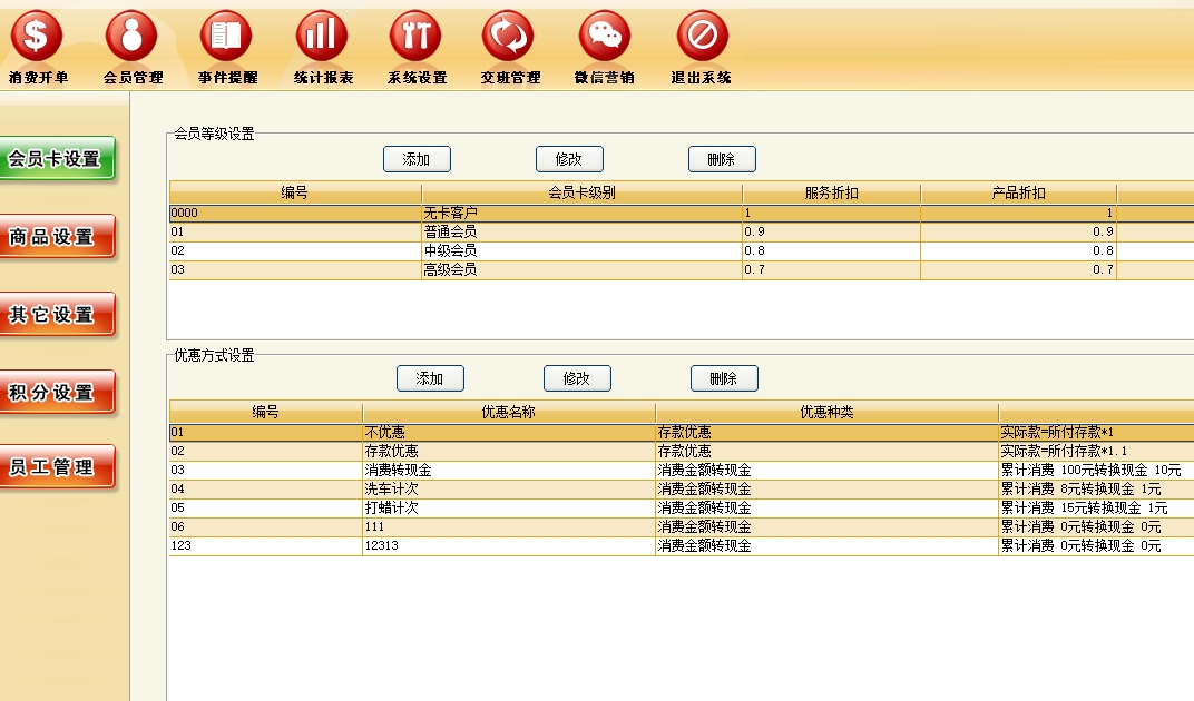 第十:汽车美容软件支持会员折扣卡和储值卡,可以根据自己的需要设置不同的优惠方式,灵活简单。