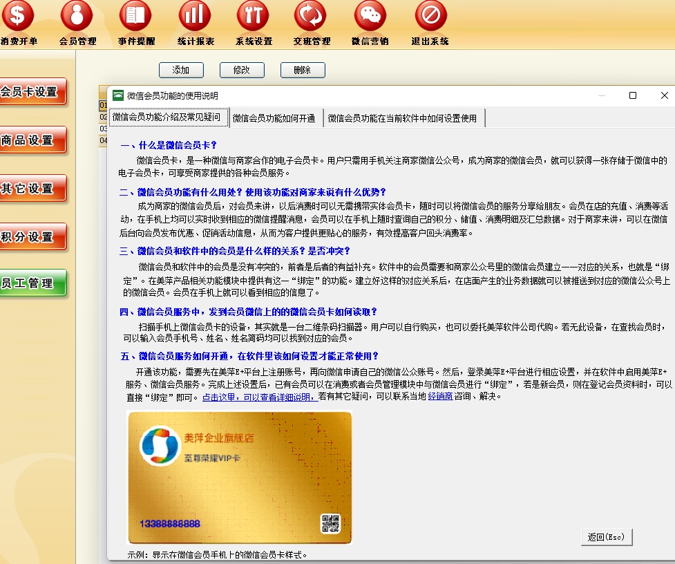 3. 提升客户服务水平:软件可以实现会员卡的发放、充值、消费等操作,方便店家进行会员管理和维护,提高客户服务水平,增加客户忠诚度。