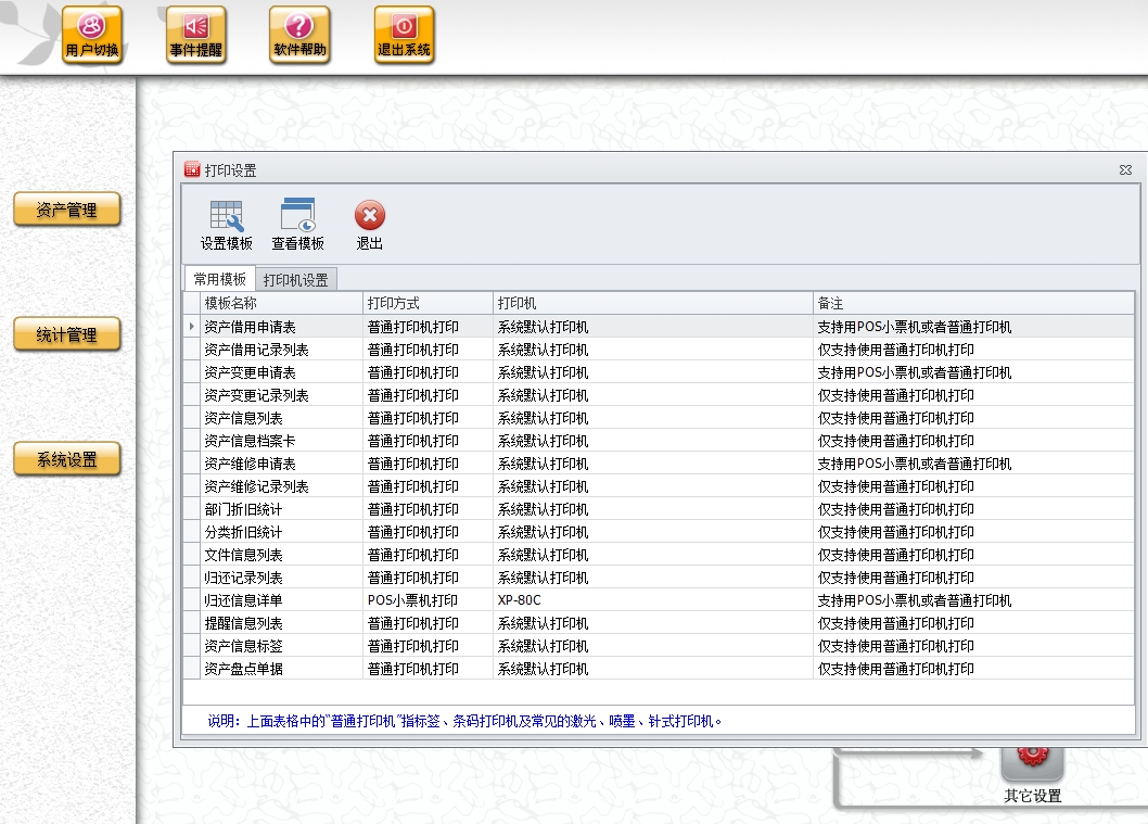 第十四:固定资产软件支持自定义报表、凭据模板内容格式,且支持选择通过POS小票机、普通打印机打印报表、凭据。