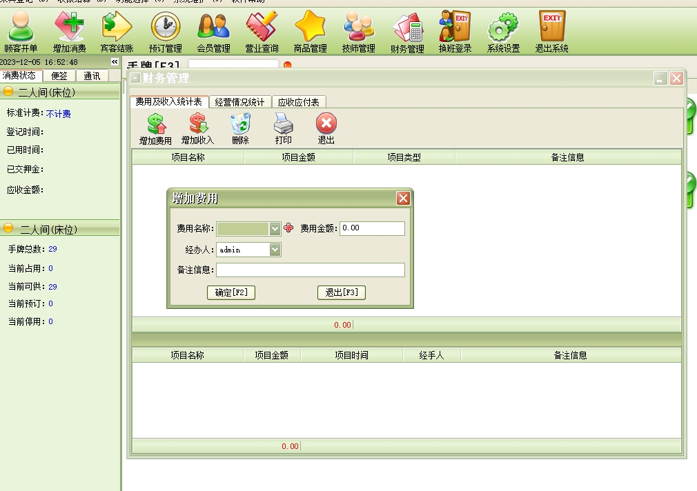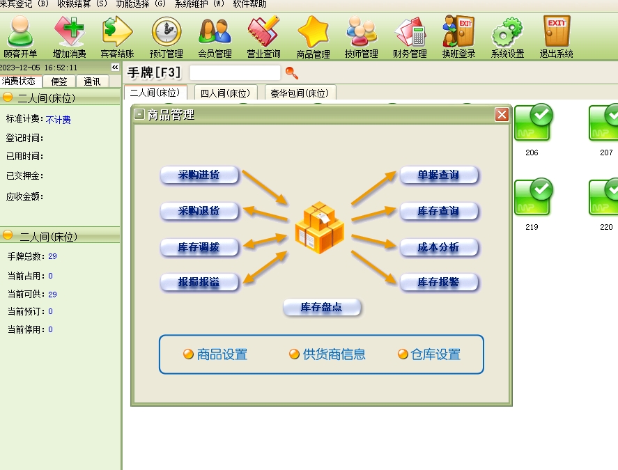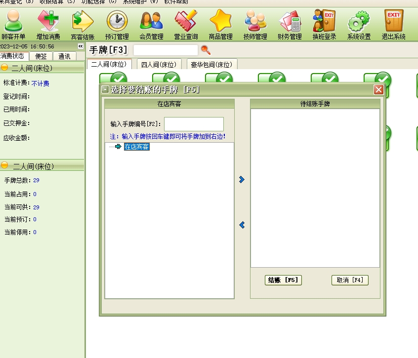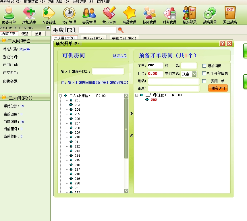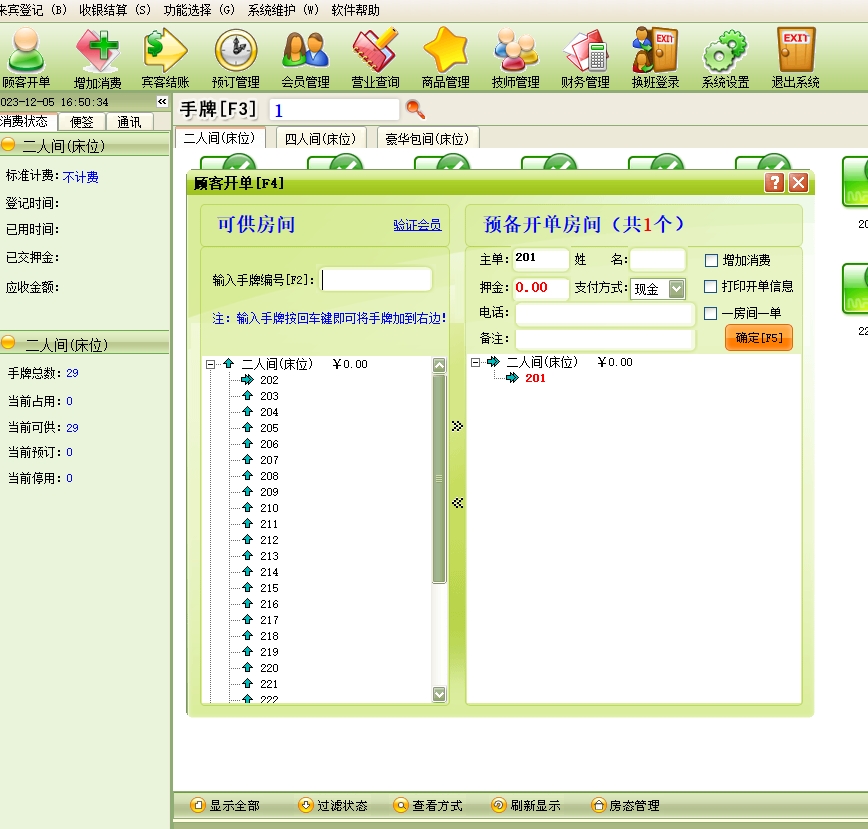 第十:足疗软件具有房态管理功能,选中房间即能看到消费情况。
