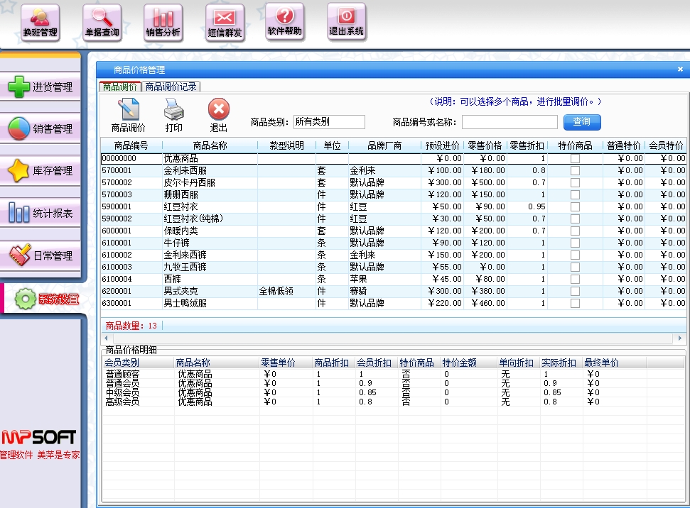第十三:服装销售软件提供简单强大的商品调价模块,特别适合服装等商品按照折扣业务的习惯。