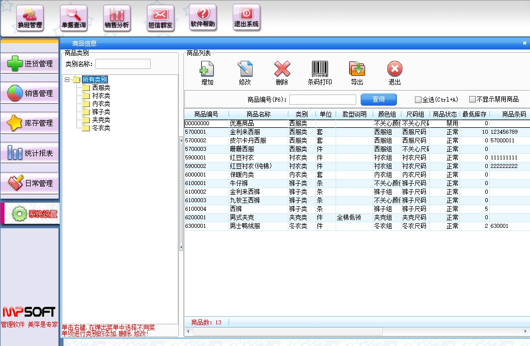 第十五:广泛适用于服装业务企业,服装鞋帽专卖店,服装业务门市等用来作为服装业务管理软件。