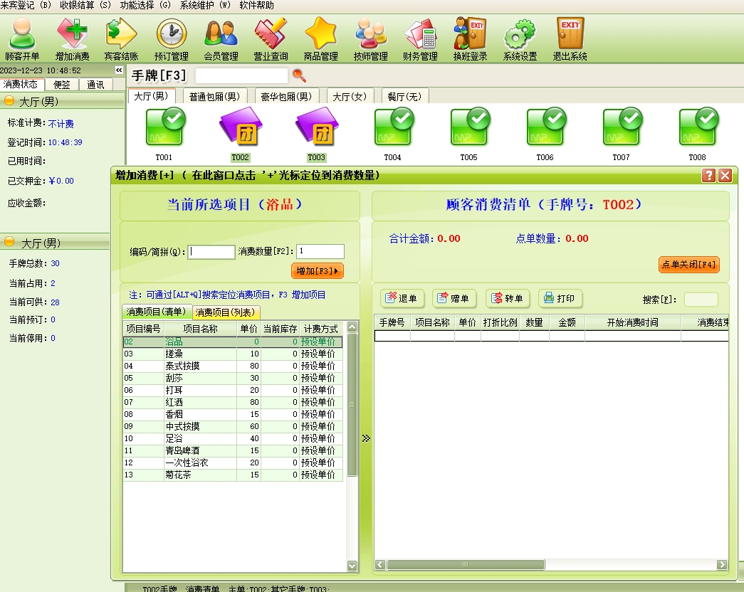 第十六:桑拿洗浴软件点单消费→增加消费:客人在消费过程中所消费的所有项目均要进行入帐处理,以便在客人离店时自动计算消费额。客人的消费明细便是在此入帐。