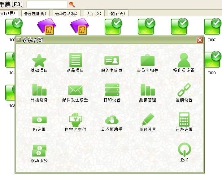 第二:桑拿洗浴软件包厢项目:包厢项目也可以理解为包厢的种类(例如可分为豪华包厢、普通包厢等)。具体到某个包厢类型都有其相对应的手牌,而每个手牌就具体到某一来店登记的宾客,一般把手牌提供给一个客人后,在当前客人未退出占用状态前暂时无法提供给另一个客人消费。此项目在系统设置中设置,在宾客开单时使用。