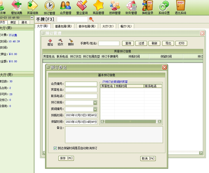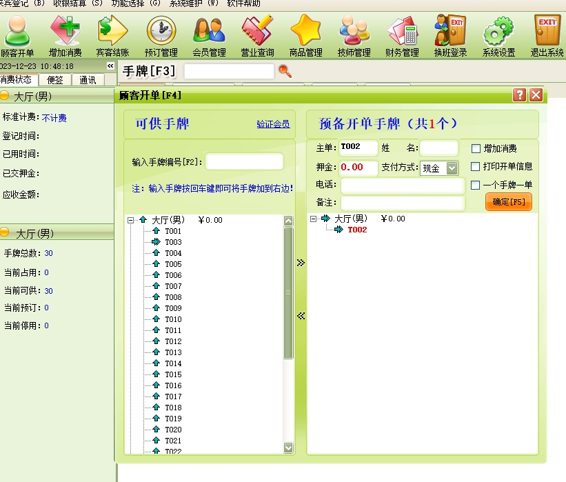 第十四:桑拿洗浴软件来宾登记→顾客开单:每个客户发生消费前必须进行登记(建立客户帐),给客户安排一个包厢(手牌)等包厢项目,包厢项目必须是在“系统设置”模块中的“包厢项目”中已经设置,系统只能对已设置的包厢项目(手牌)进行登记。