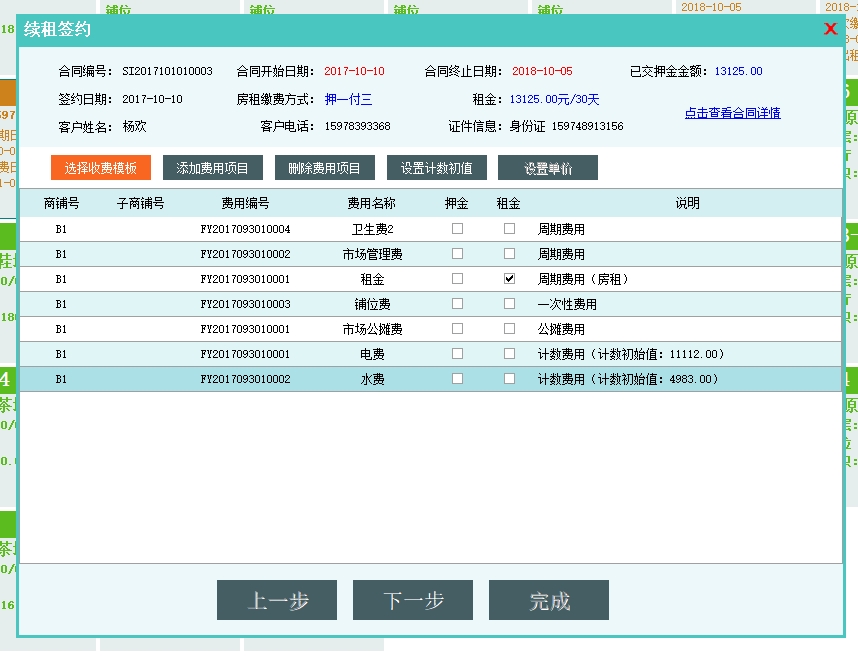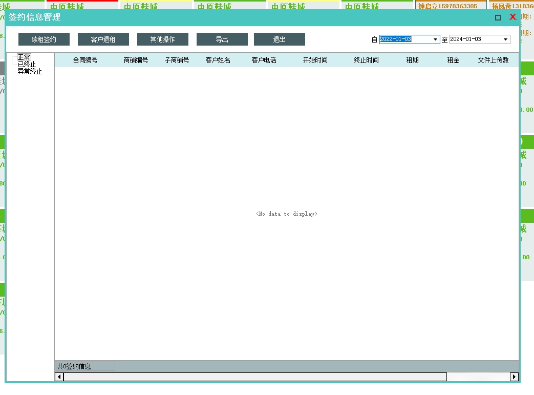 第五:市场商铺租赁软件可以管理出租签约信息,支持提前终止合同、合同信息补打以及缴费日历功能。签约管理界面可以快速续签和退租,功能强大方便。