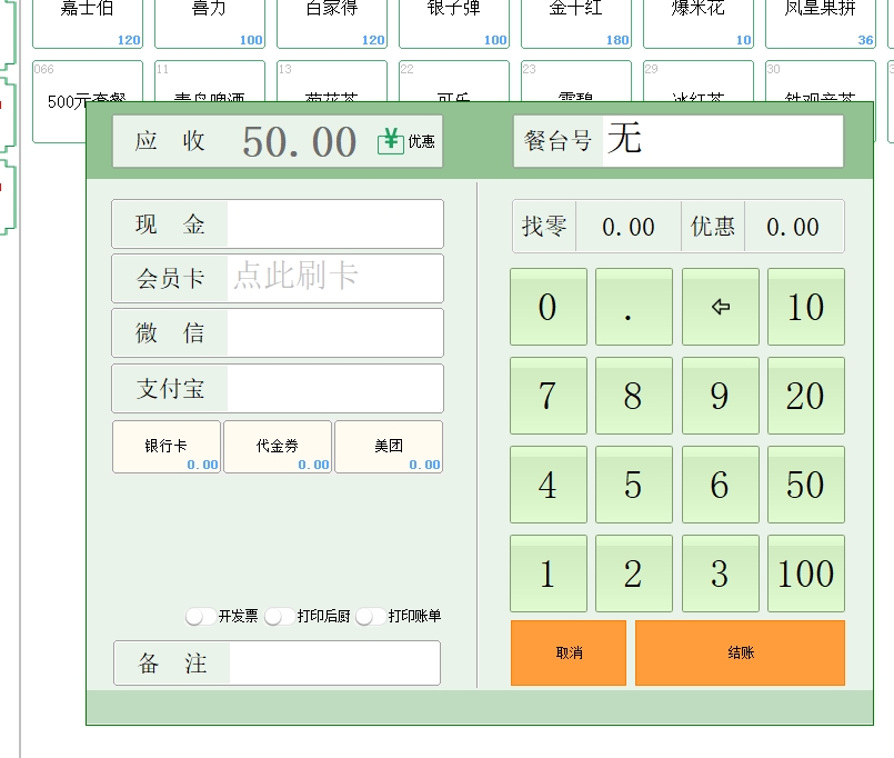 第三:酒吧软件提供收银结账管理,支持联合结账,支持多种支付以及免单和欠单。