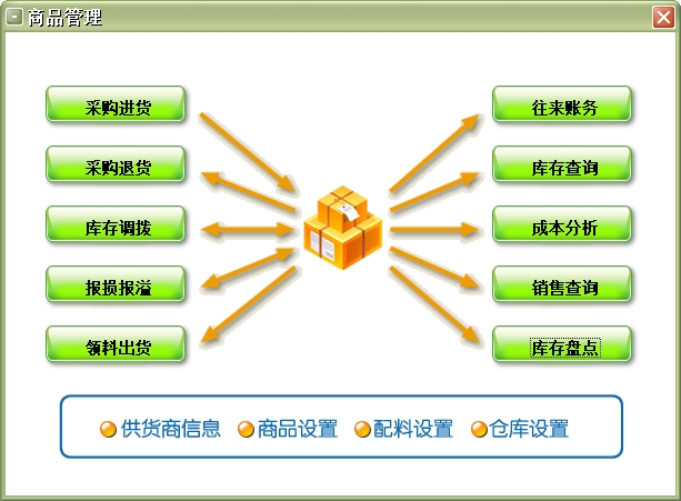 第十五:酒吧软件支持商品管理功能:对本店供应的商品进行日常管理,如:进货,退货,仓库单的调拨、报损、报溢、库存查询、成本分析、库存报警、往来账务等。