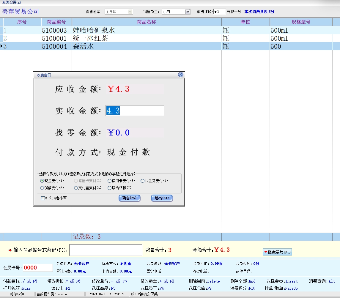 第十一:会员销售软件支持多种结帐方式:现金、储值卡、代金券、信用卡。