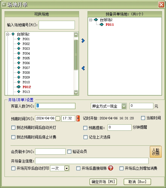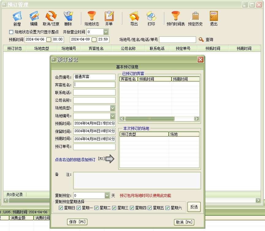 来宾登记→场地开单:每个客户发生消费前必须进行登记(建立客户帐),给客户安排一个场地,场地项目必须是在“系统设置”模块中的“场地设置”中已经设置,系统只能对已设置的场地进行登记。