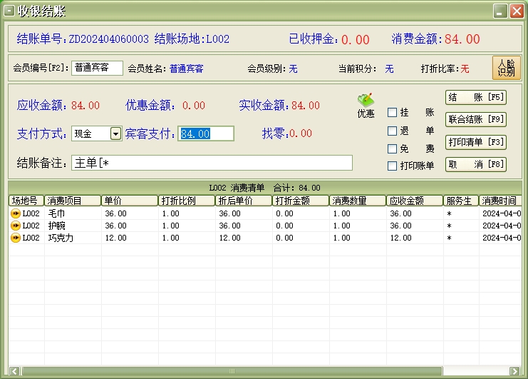 收银结账→宾客结帐:终结客户当前的消费活动,并进行收款及自动还原场地项目(场地)的占用状态为可供状态(或清理状态)。