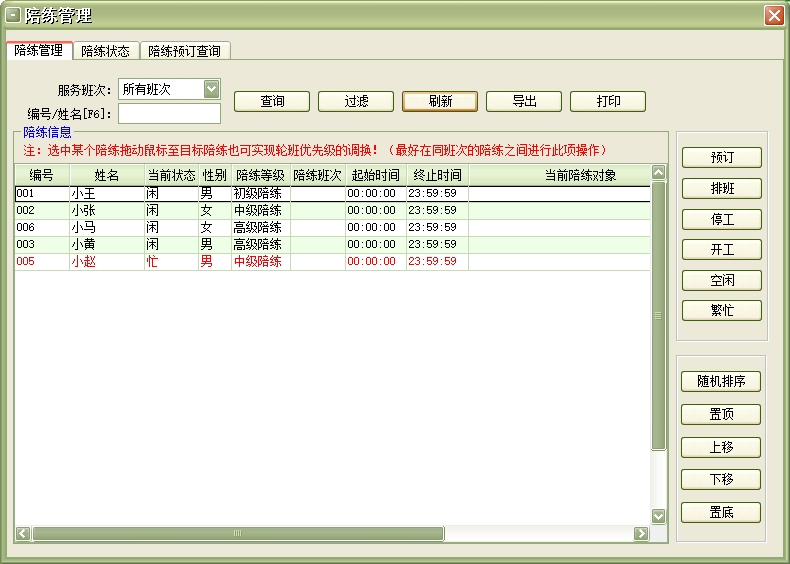 陪练设置:陪练是指能为宾客提供服务的本店员工,在此设置中可增加、修改、删除陪练信息,还可为每个陪练设置相应的陪练等级(例如:高级陪练、中级陪练、普通陪练等)。有了陪练等级可在商品项目中为每种服务项目所对应的陪练等级设置相应的提成金额(如果有此需求),此项设置可为宾客提供服务的陪练自动计算提成金额。