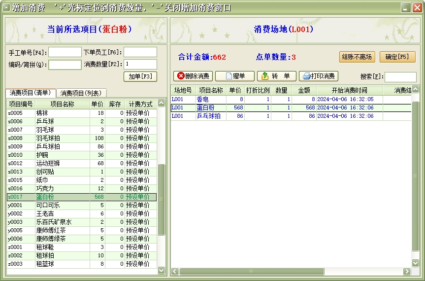 点单消费→增加消费:客人在消费过程中所消费的所有项目均要进行入帐处理,以便在客人离店时自动计算消费额。客人的消费明细便是在此入帐。